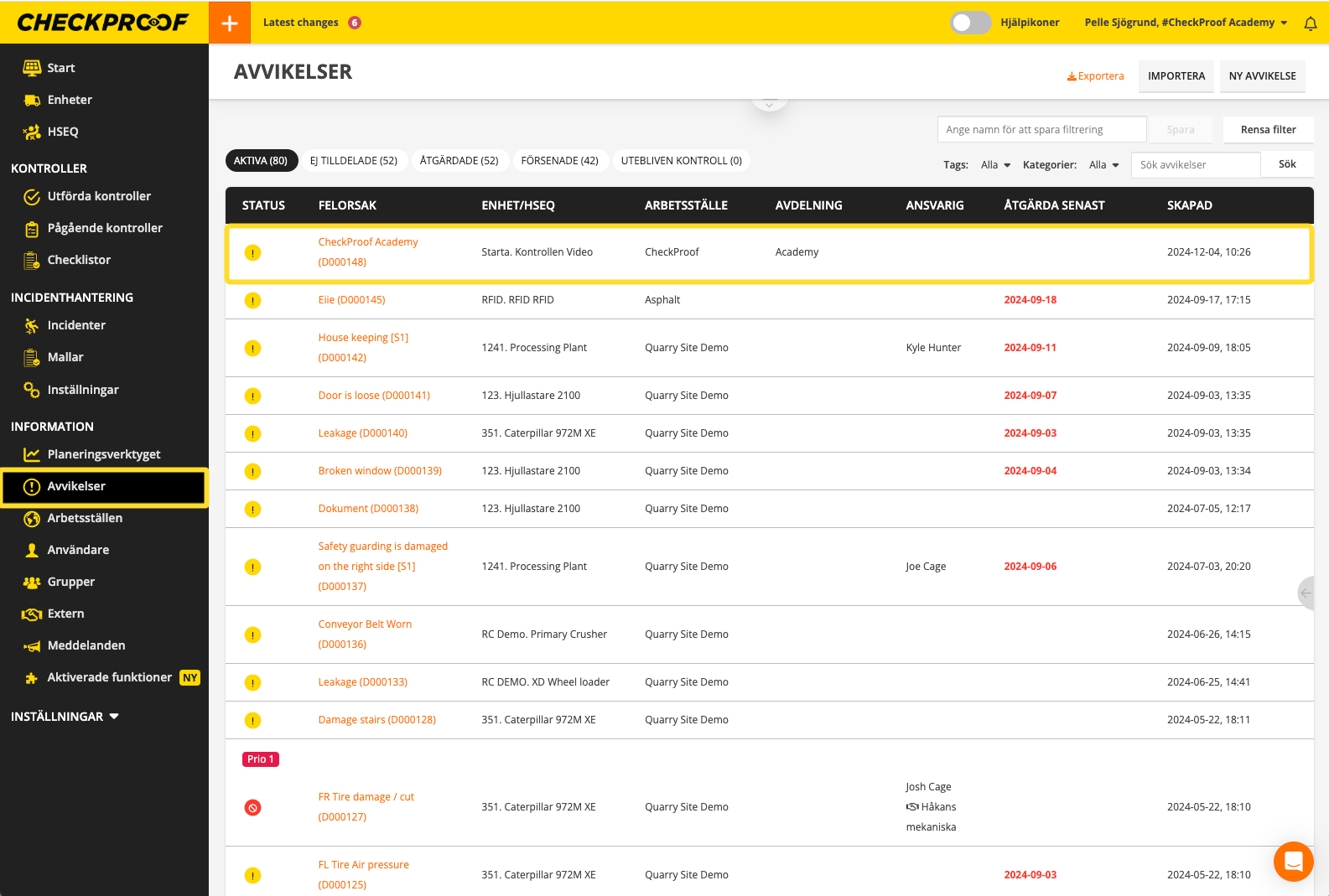 Alla rapporterade avvikelser sparas i CheckProof Admin Panel.