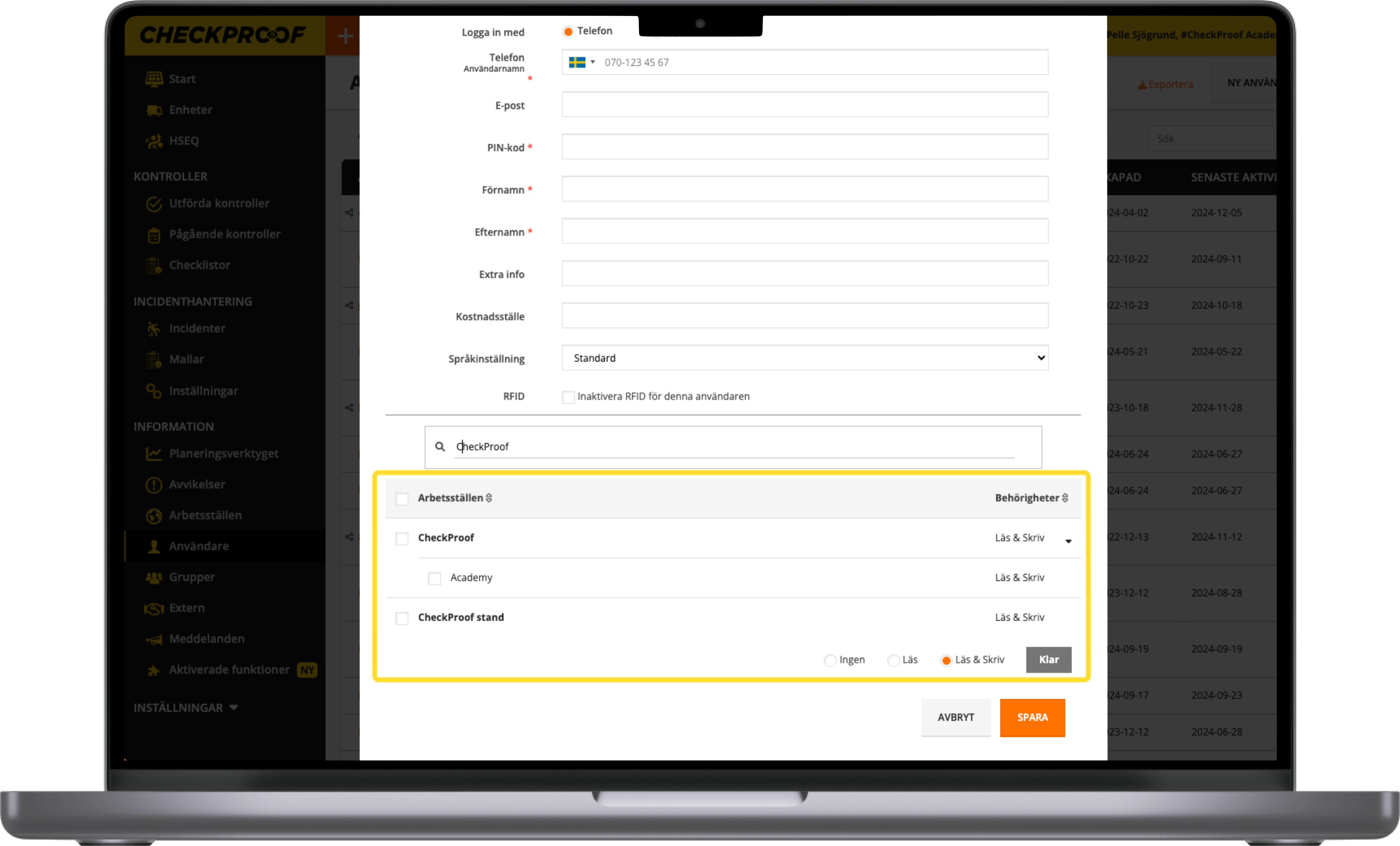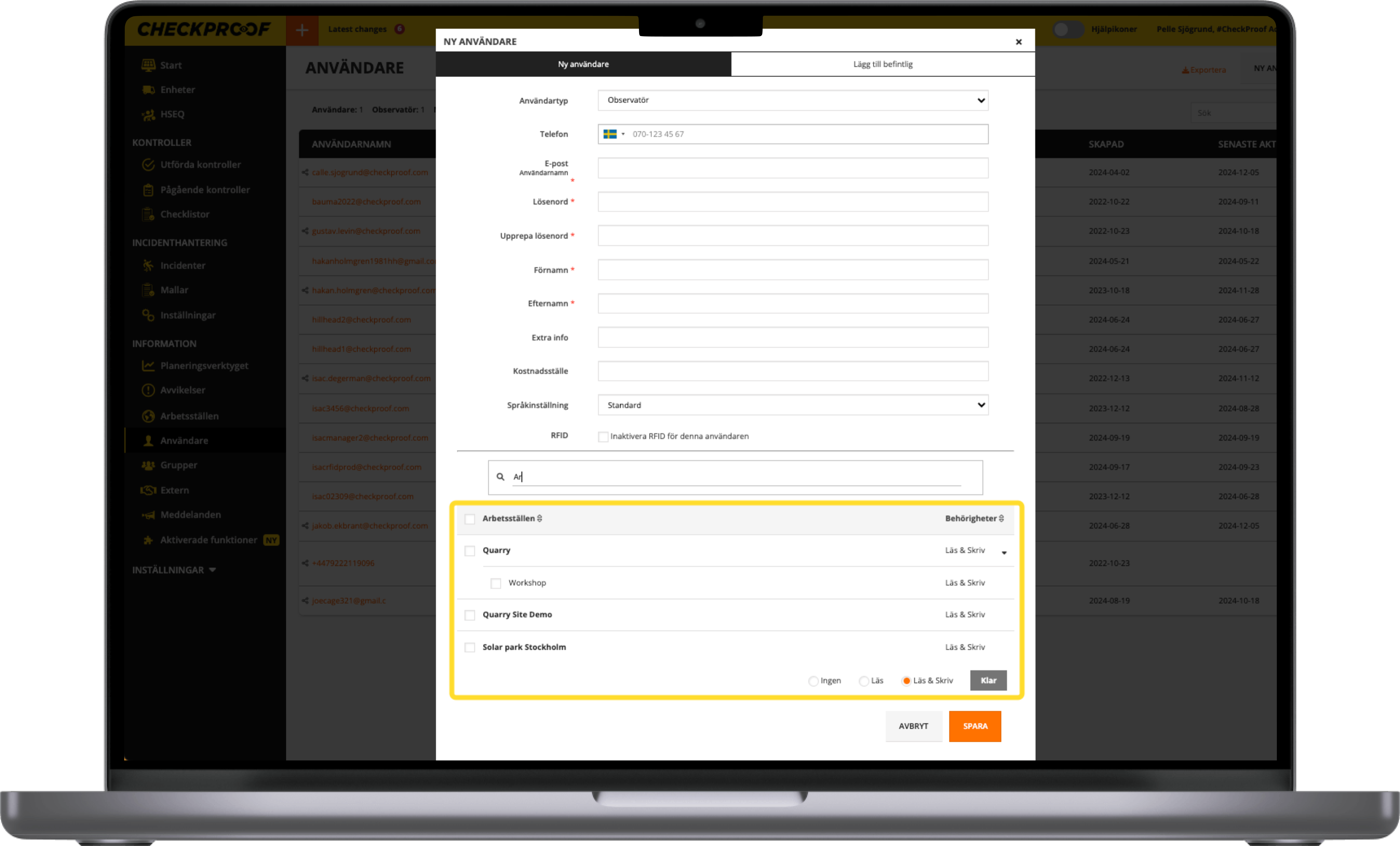“I de följande fälten, det andra och tredje fältet, kommer du att ställa in användarens behörigheter. Användare kan ha olika behörigheter på olika arbetsställen.