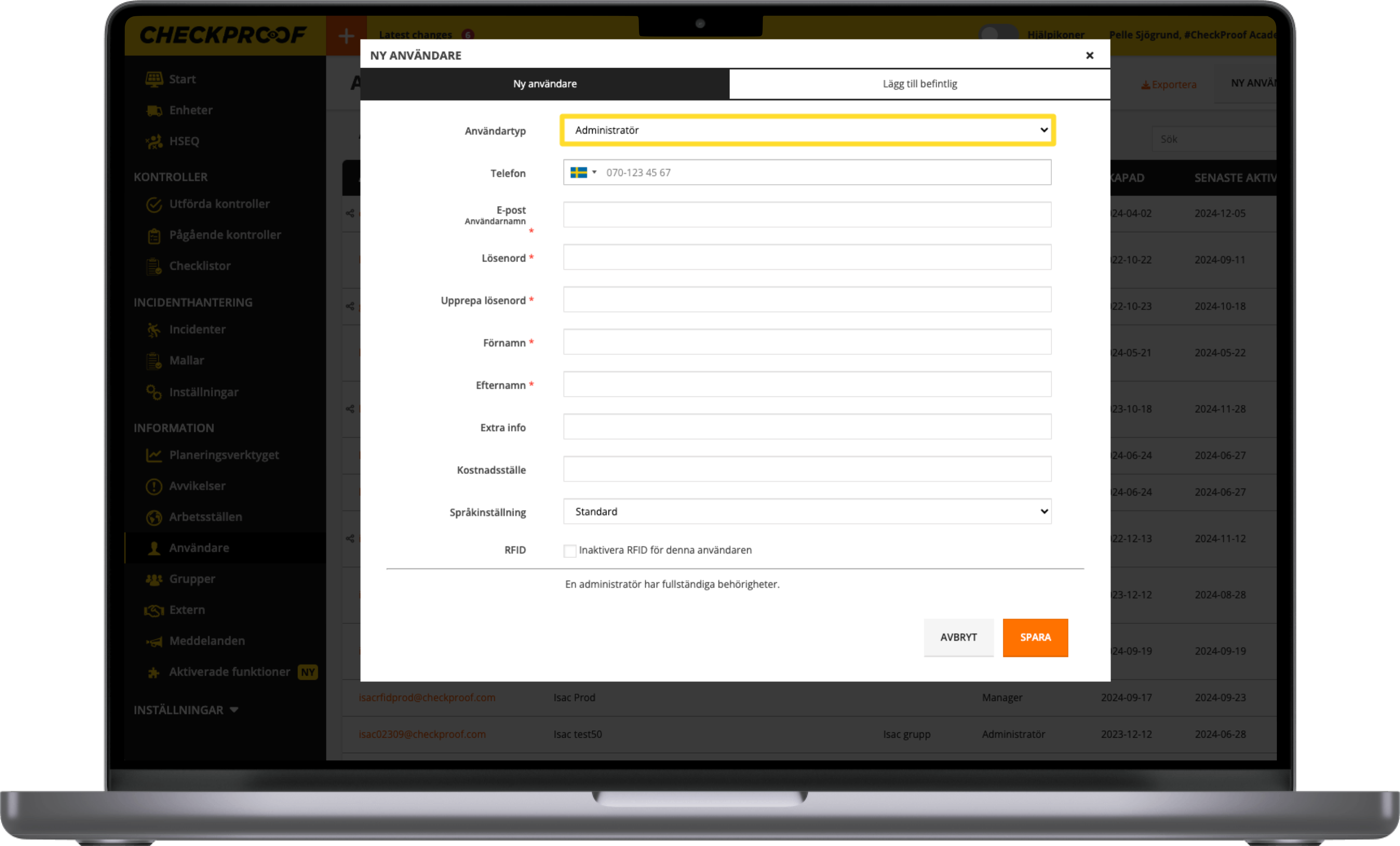 I fältet “Användartyp” väljer du “Administratör” från rullgardinsmenyn. Fyll i de obligatoriska fälten som återstår, de är markerade med en asterisk: