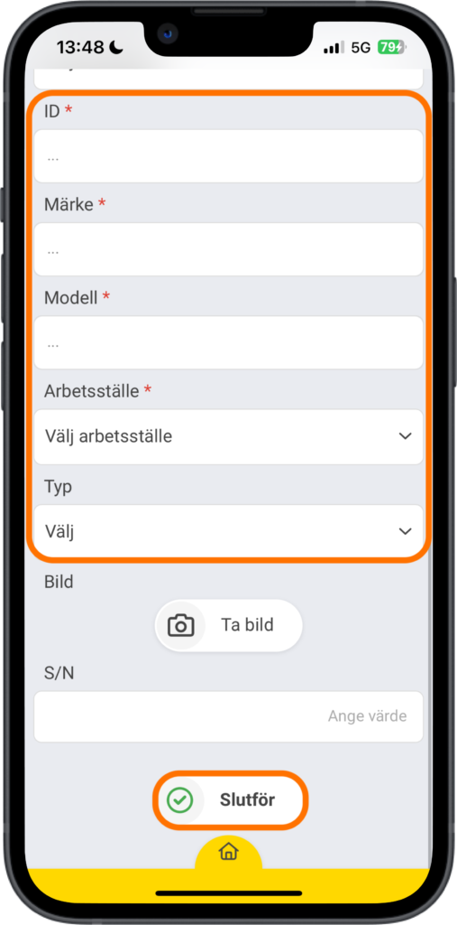 Obs: Det kan finnas några andra fält som du kan fylla i beroende på det förinställda enhetsformuläret som skapats av administratören på adminpanelen (t.ex. bilder, platser, tankning, etc.).