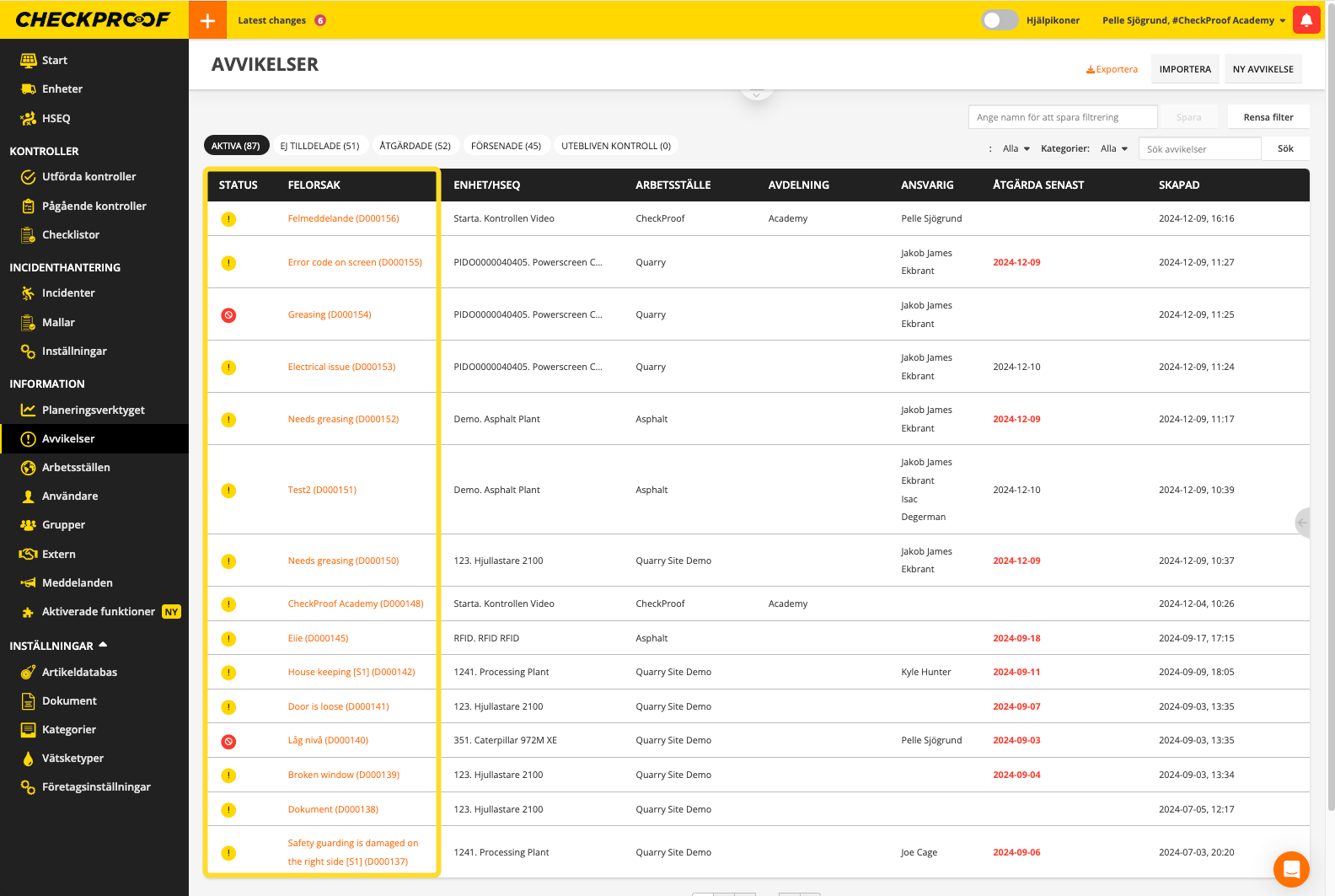 Som standard kommer du att se de 3 huvudsakliga avvikelse statusarna, röd, gul och grön. “Avvikelse taggar” fliken låter dig lägga till ytterligare taggar till avvikelsen.
