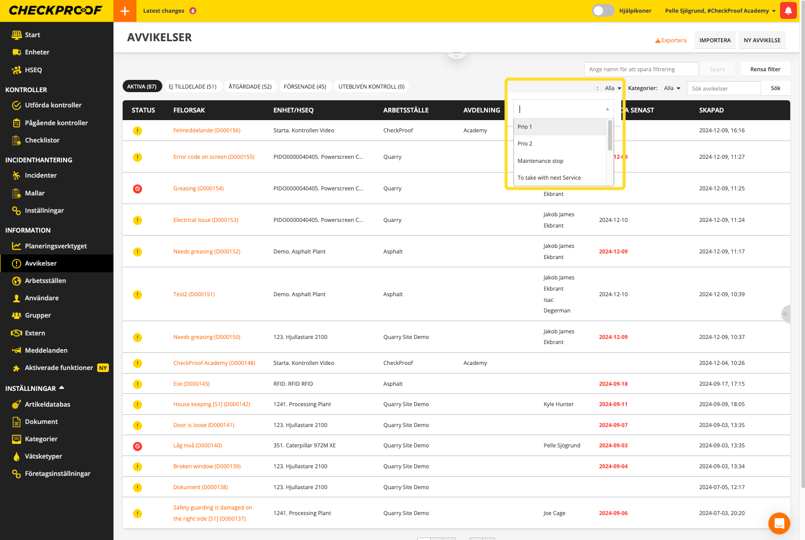 Avvikelse taggar ger dig ytterligare filtermöjligheter för att tagga olika avvikelser.