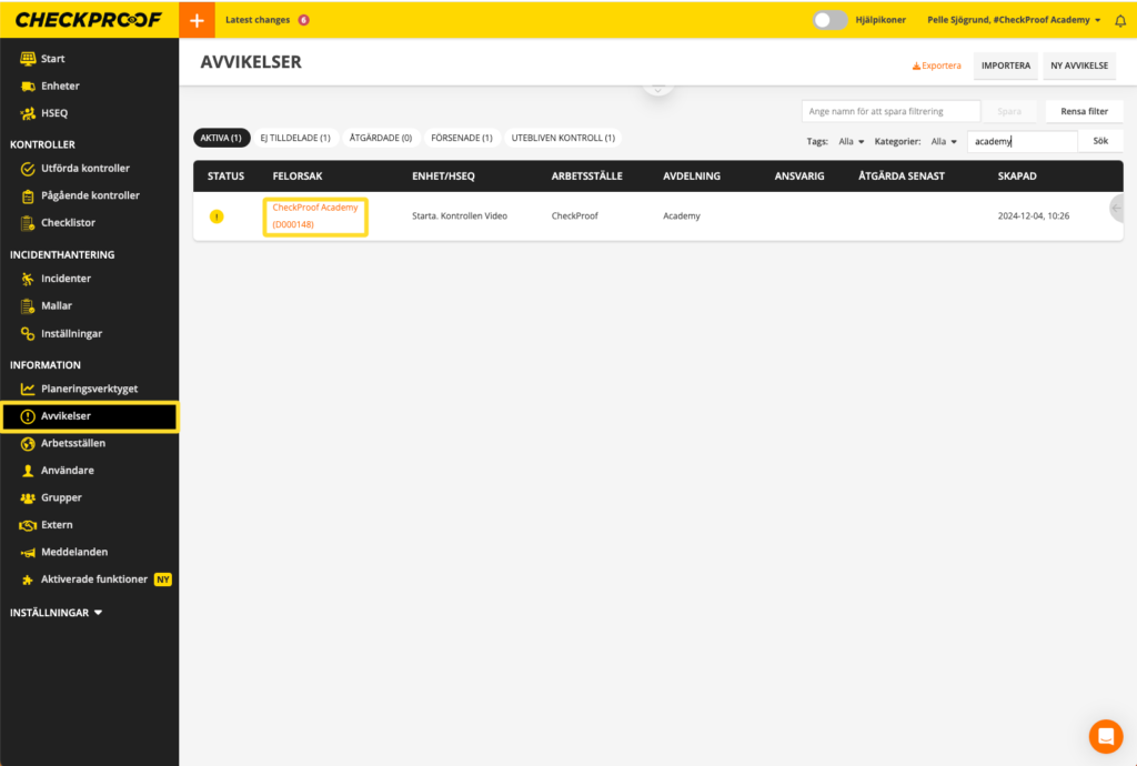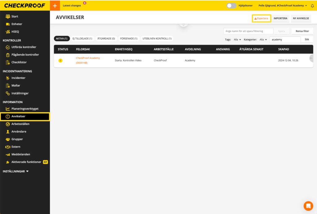 Bra! Nu vet du hur du exporterar en specifik avvikelse från CheckProof Admin Panel.