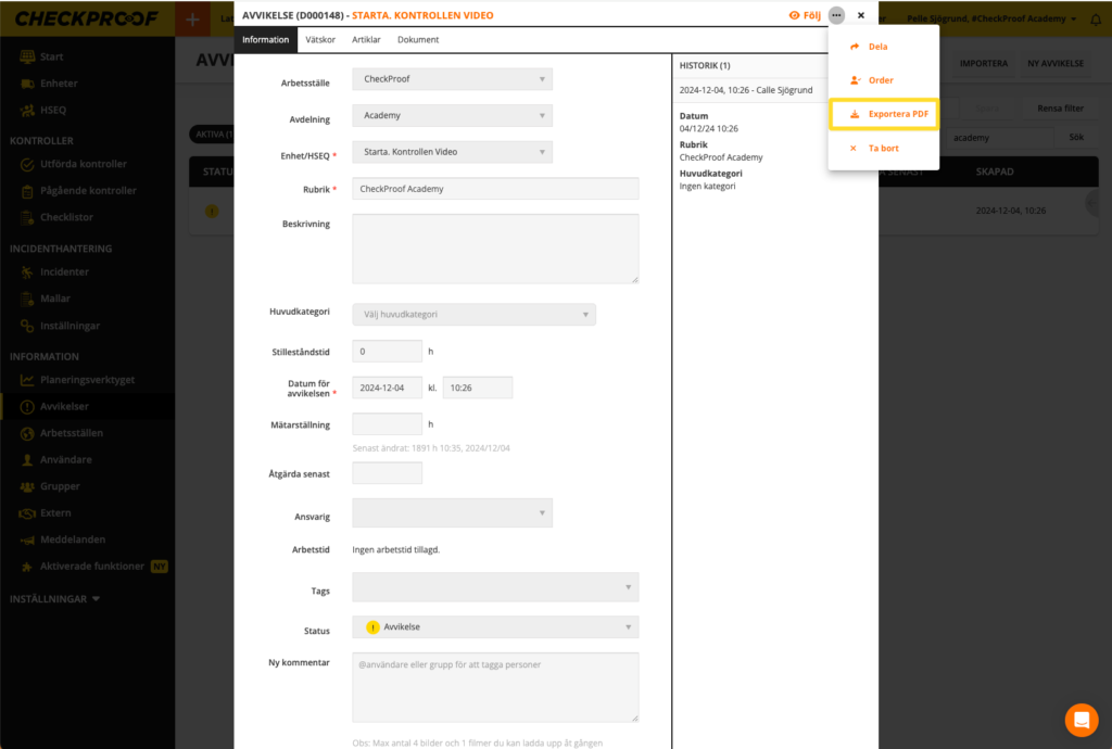 Här kommer du att se informationen relaterad till denna avvikelse. Klicka på knappen “Exportera PDF” i det övre högra hörnet.