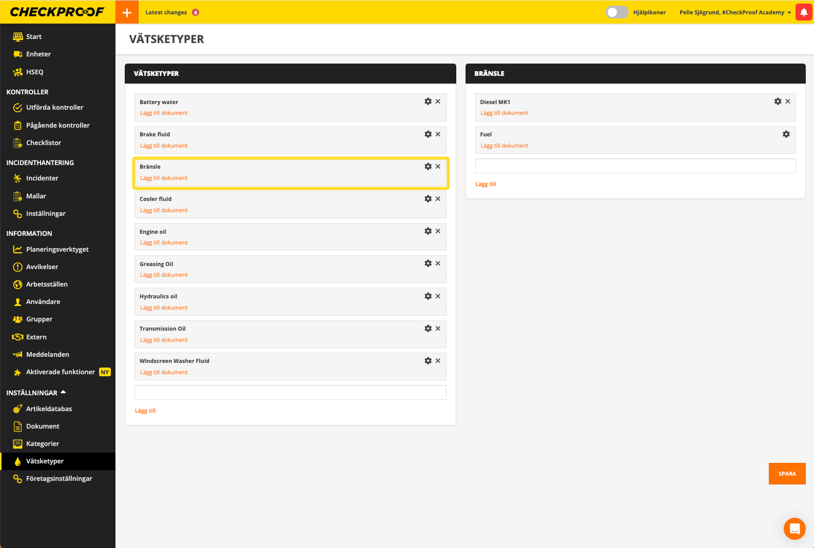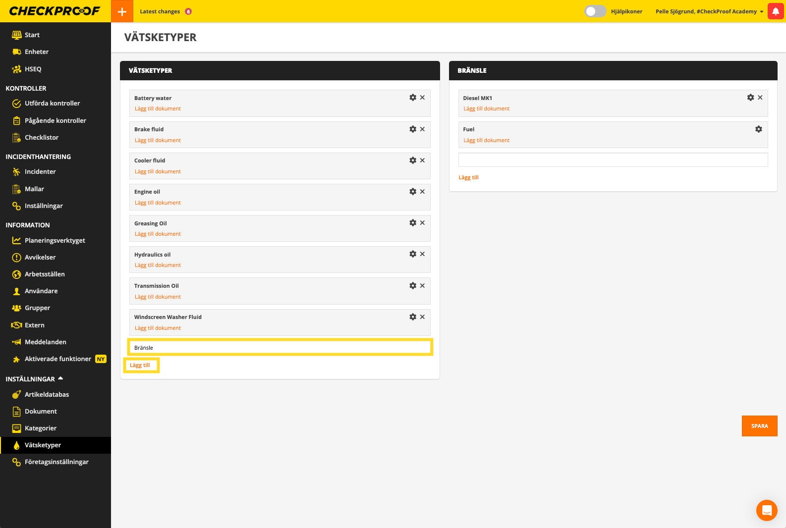 Här kan du se en lista över vätskor som redan har lagts till i ditt företags databas. De är uppdelade i två listor: