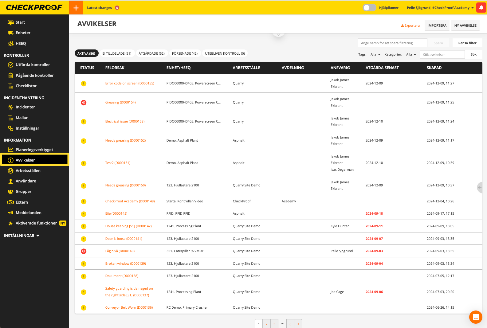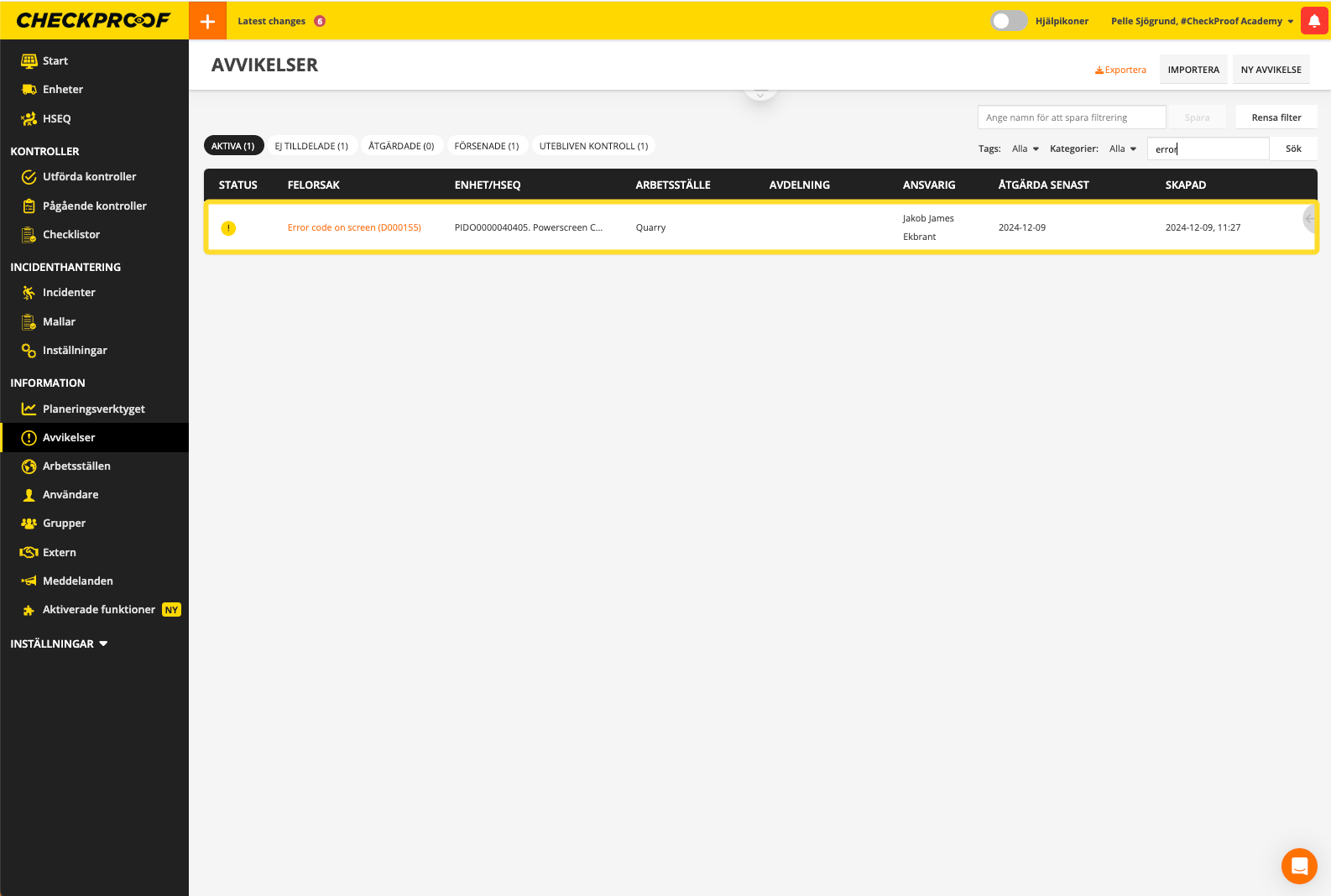 Från CheckProofs startsida, klicka på “Avvikelser” i sidomenyn.