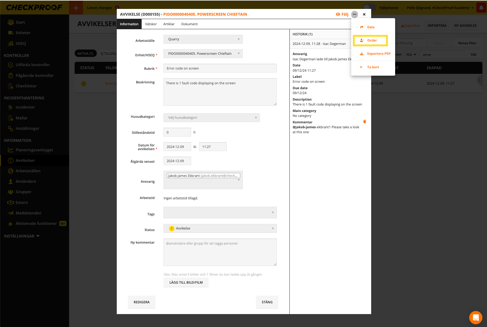 Nu kan du se och redigera information relaterad till denna avvikelse. Klicka på “Order” knappen högst upp på skärmen.