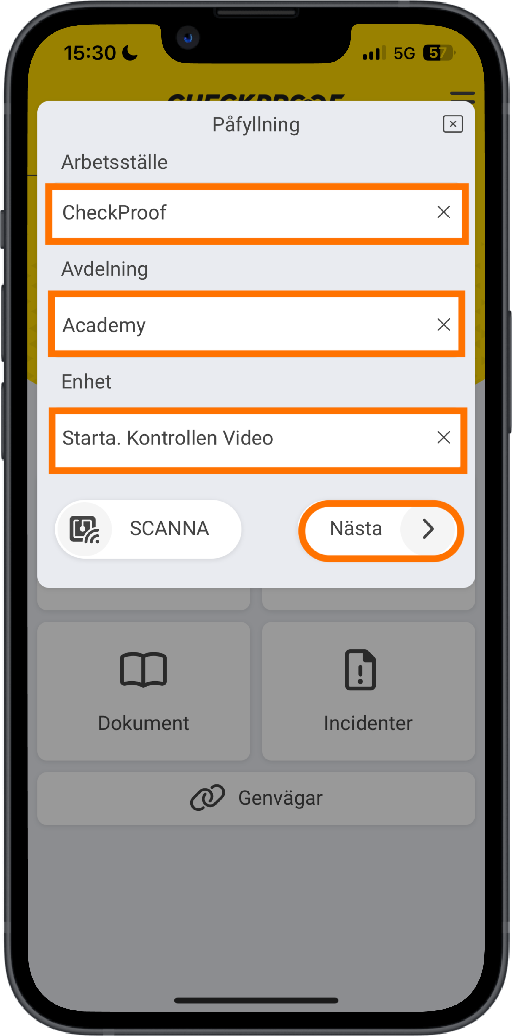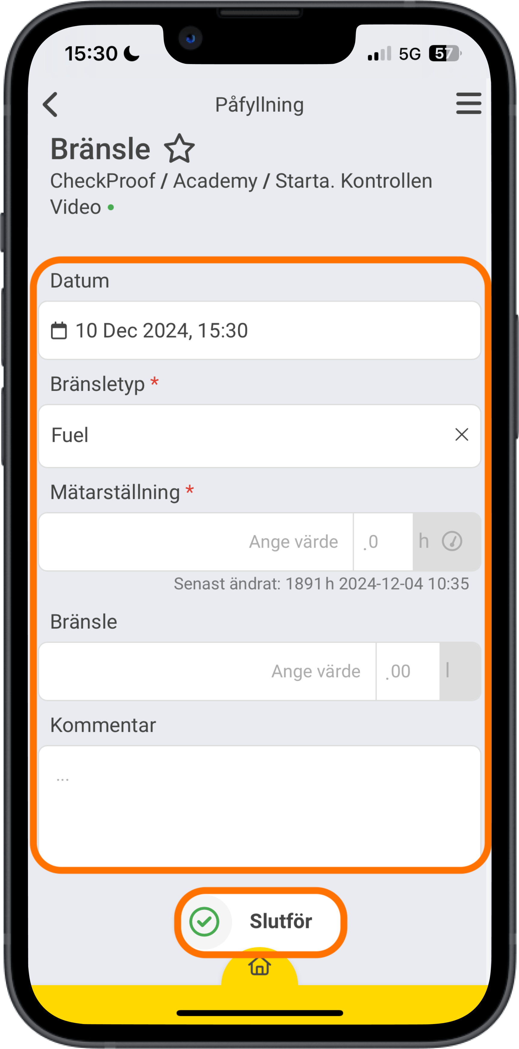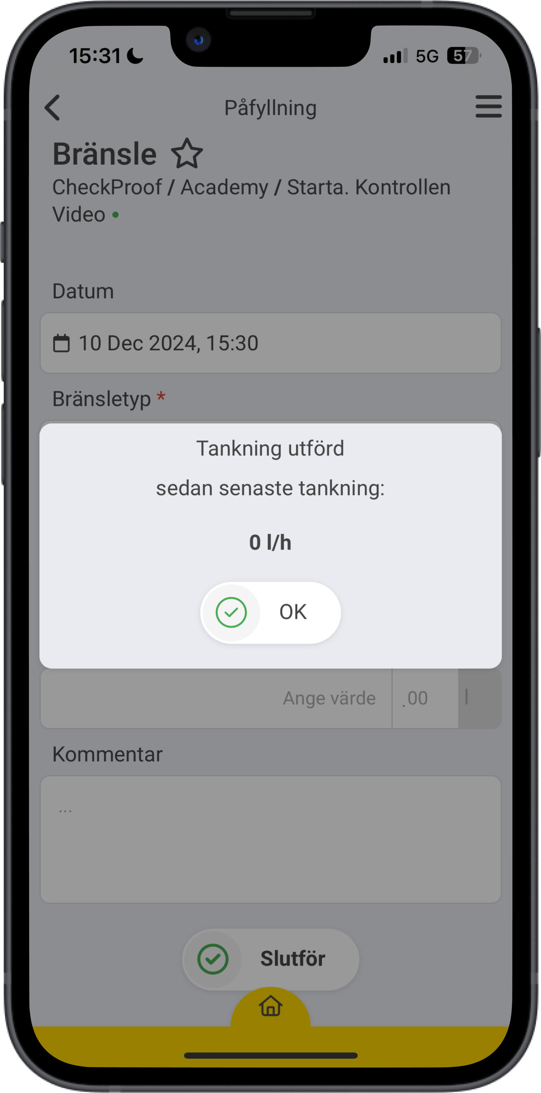 Påfyllningsfunktionen i CheckProof gör det möjligt för dig att registrera påfyllningar av vätskor i din utrustning.