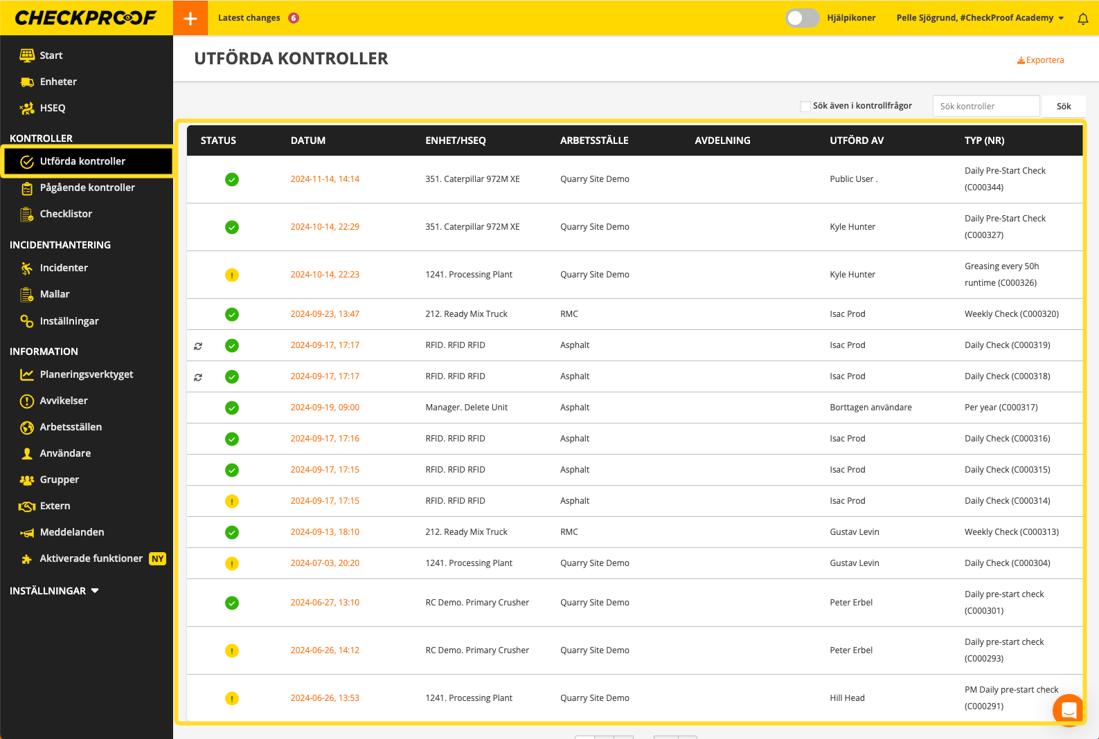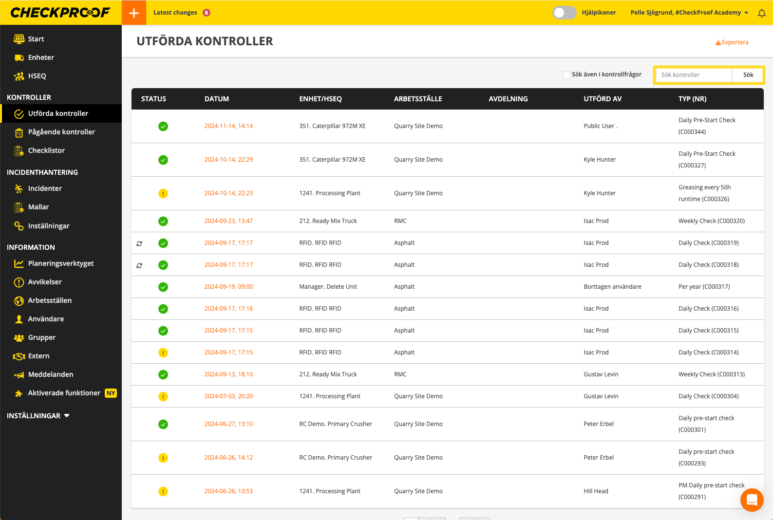 I menyn “Utförda kontroller” kan du se alla kontroller som har skickats in. Färgerna indikerar status för varje kontroll: