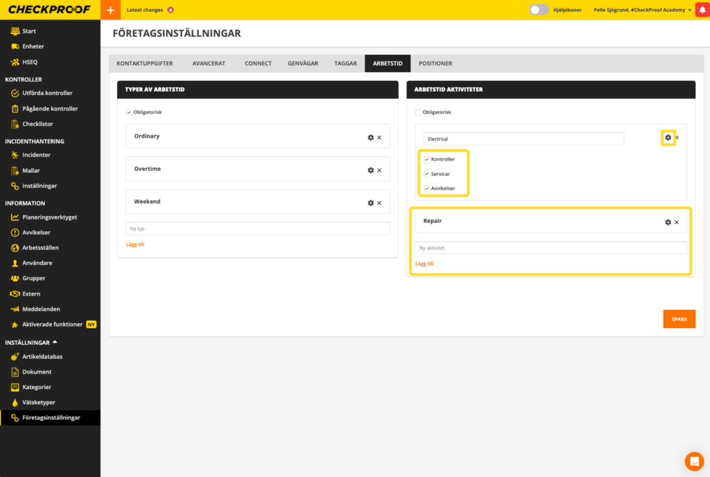 I den här sektionen kan du inkludera de olika typerna av tid som spenderas på att utföra en kontroll eller rapportera en avvikelse.