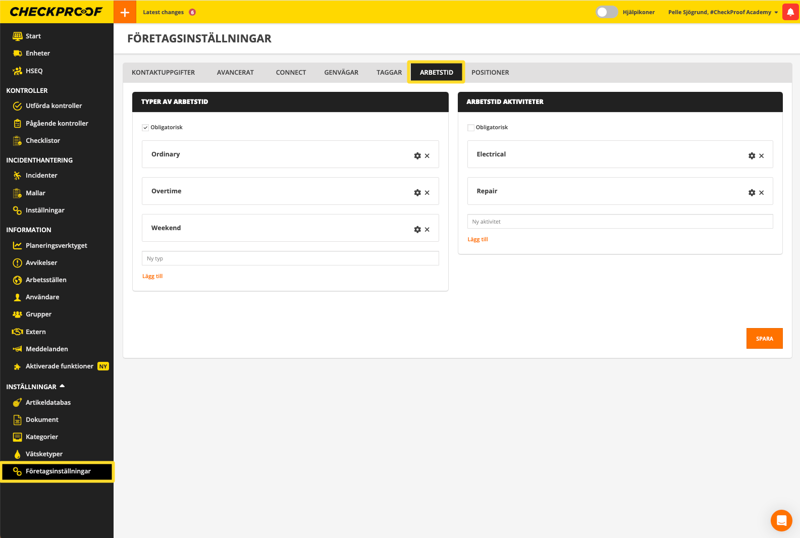 I den här sektionen kan du inkludera de olika typerna av tid som spenderas på att utföra en kontroll eller rapportera en avvikelse.