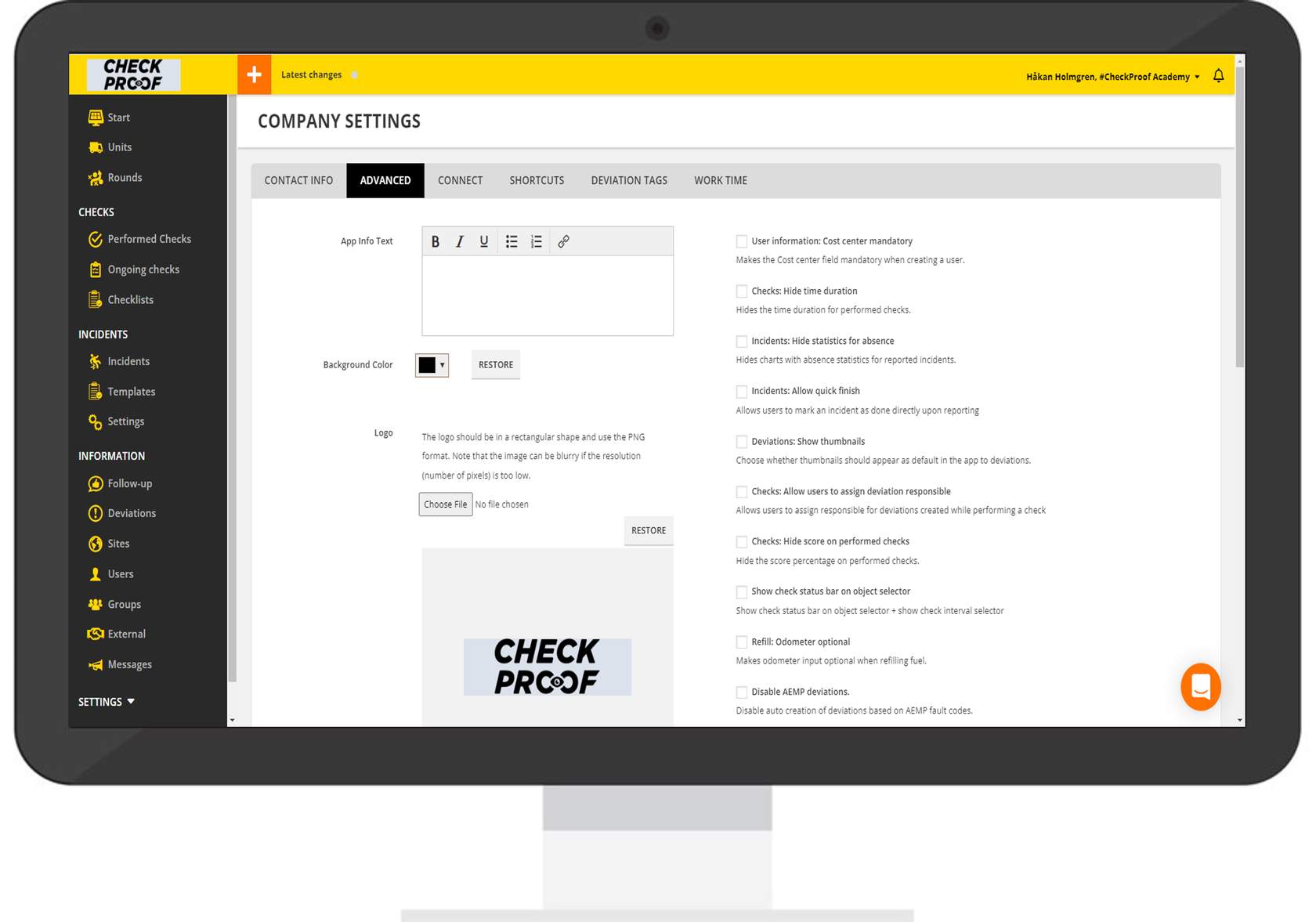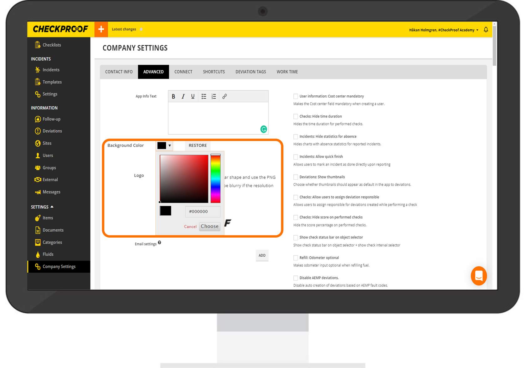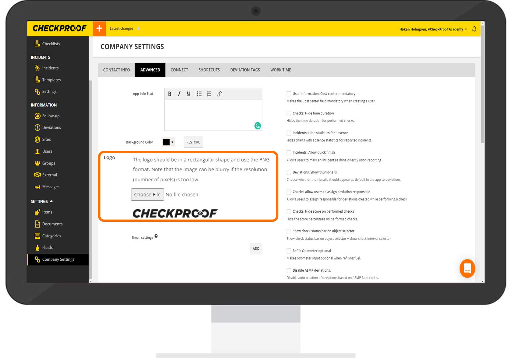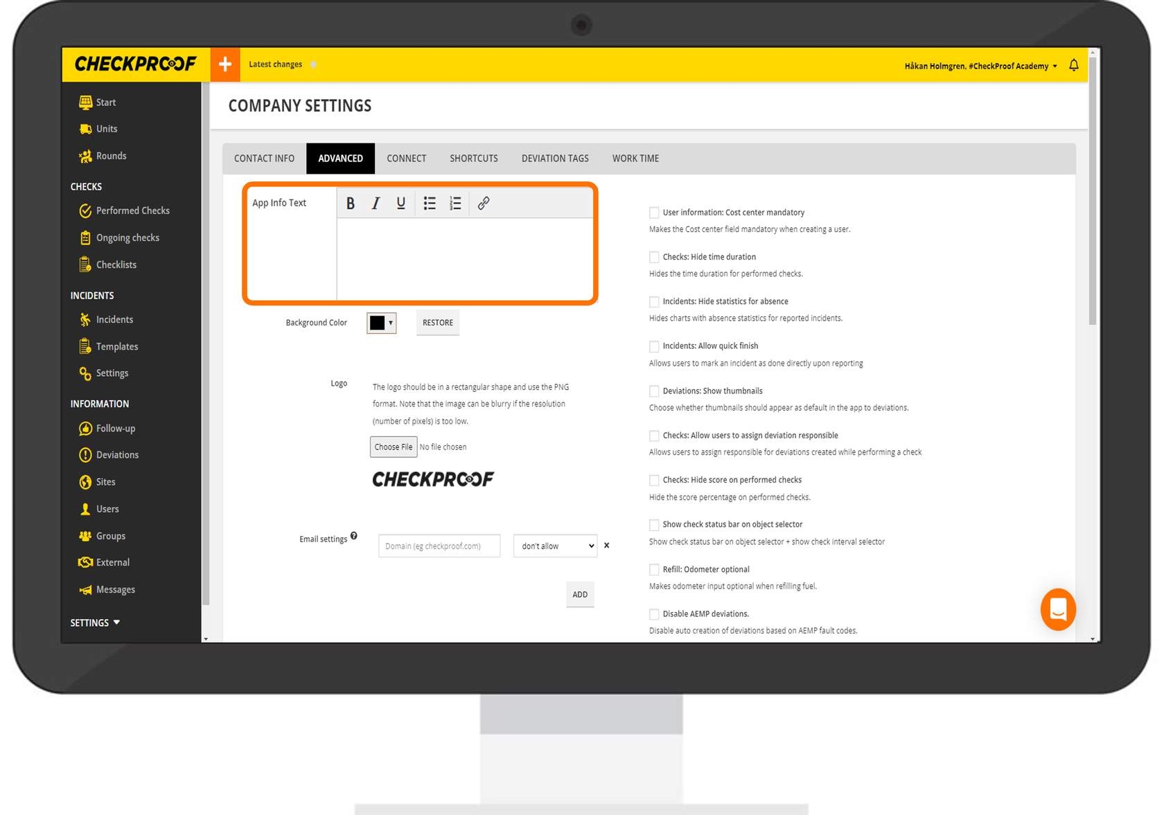 From this tab, you can add helpful text that will appear under the “Info” button in the app, upload your company logo, change the background color, and set up email settings to be applied to user creation. You can turn specific settings on or off.