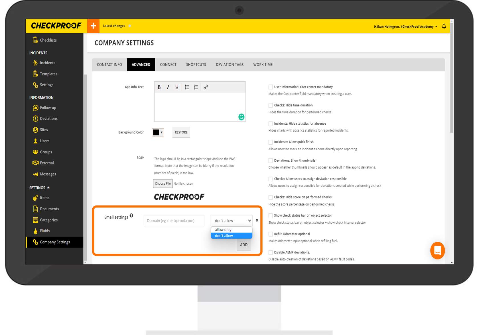 However, if you enter “CheckProof.com” in the search field and select “Don’t Allow”, emails with this domain will not be able to be associated with a user account.