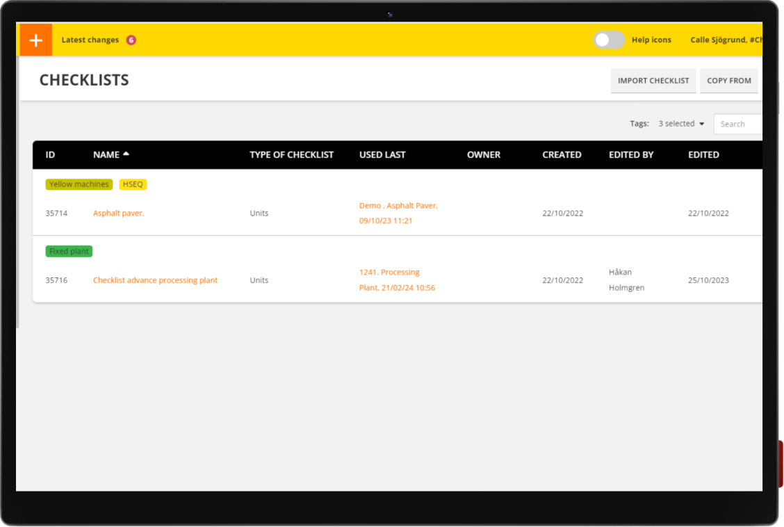 Checklist tags are a great way to tag all your checklists. For example, if you have several checklists related to wheel loaders, you can create a tag called “Wheel Loader” and assign that tag to your checklists.