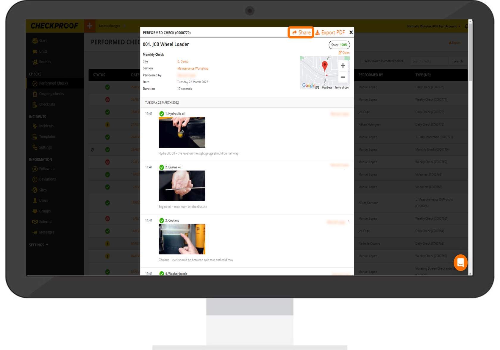 To share a check that has already been performed, you need to click “Performed Checks” in the side panel menu, and then select the check from the list.