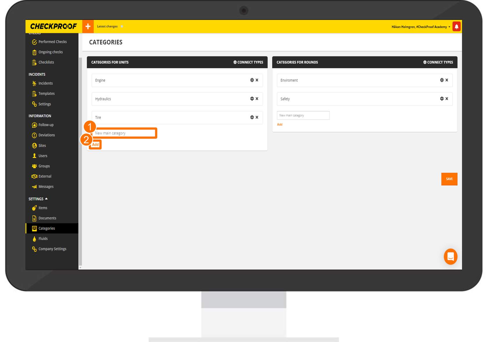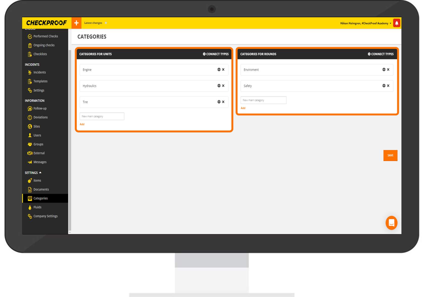 These categories will appear in the CheckProof app whenever a user reports a deviation. Categories are also used for services, inspections and fluids.