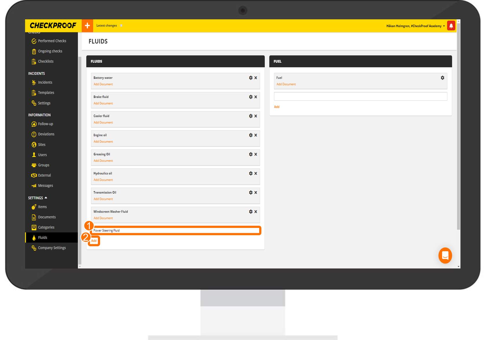 The new fluid will now be added to the list and can now be used when performing a refill task in the CheckProof app. By default, fluids are organized in ascending alphabetical order.