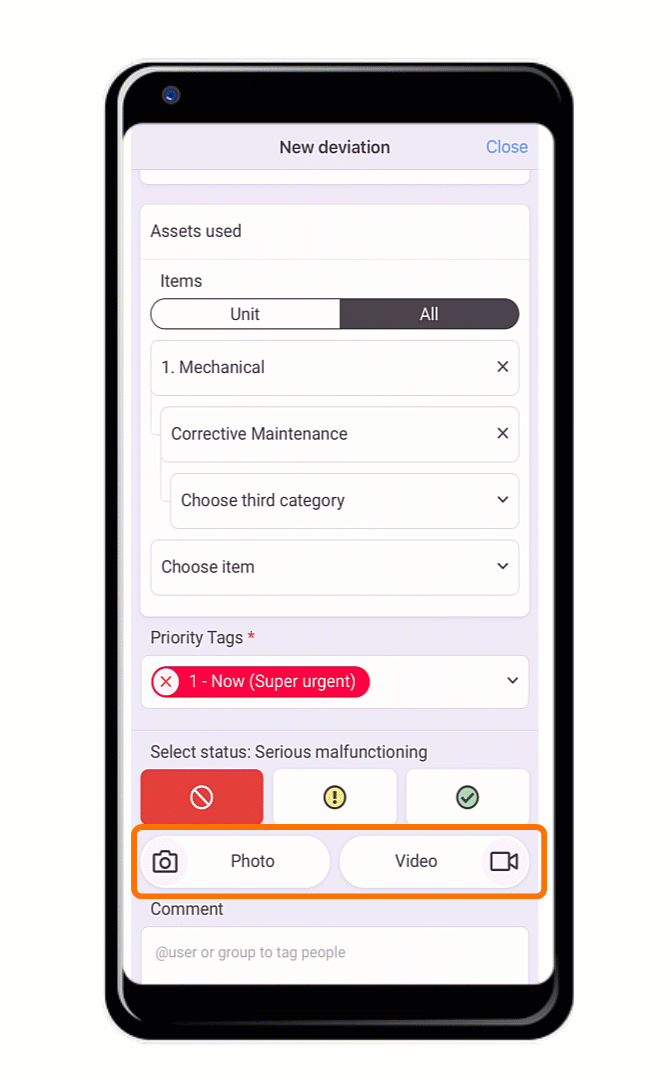 By clicking on the camera icon, you can either take a new photo or attach a photo already saved on your mobile device.