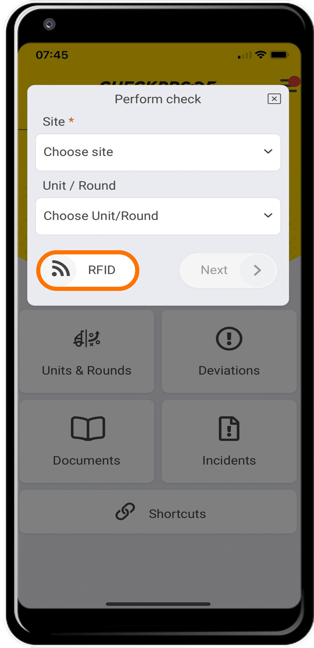 Now your mobile phone is ready to scan. Hold it near the NFC tag of a unit/round that you want to perform a check on.