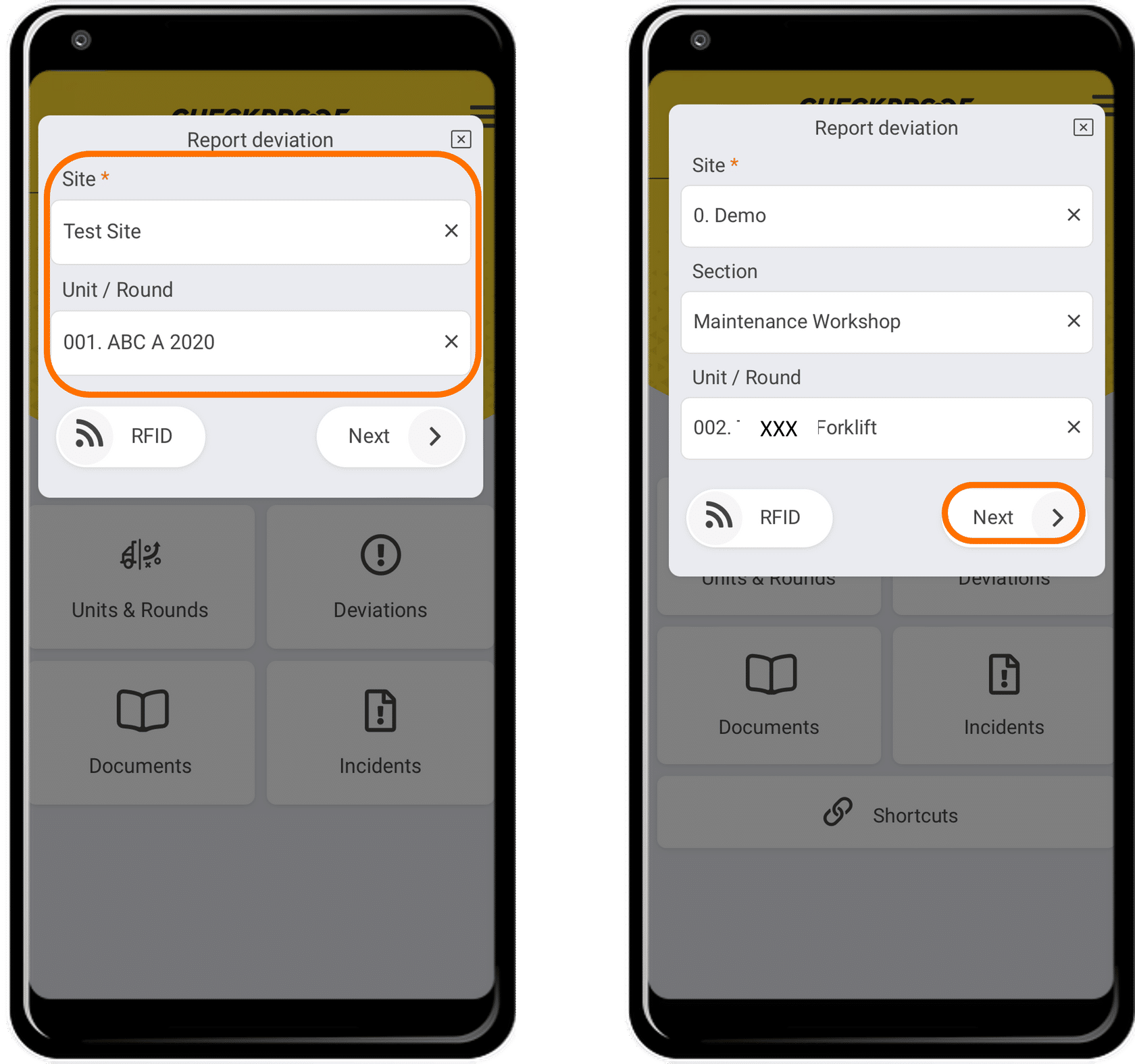 The only difference between creating a deviation directly from a check is that you now need to select the “Site” and “Unit/Round” you are referring to.