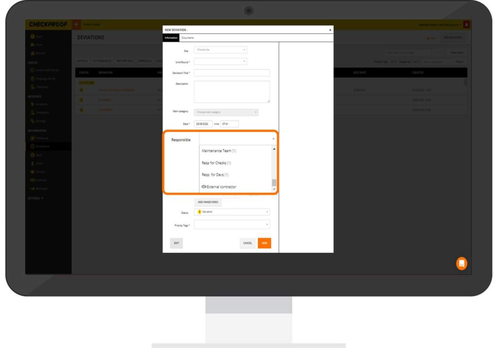 A form will appear on your screen that needs to be completed in order to create the deviation. To assign someone responsible for this deviation, you should click the “Responsible” field, then select a user from the drop-down list.