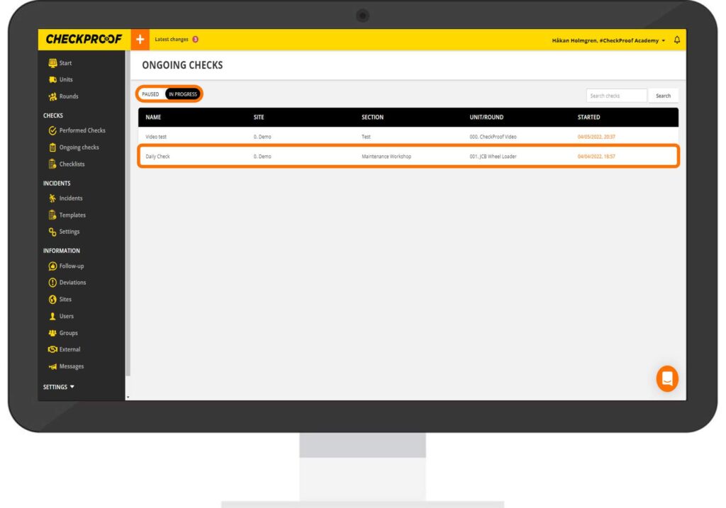 You can switch between the “In Progress” checks and “Paused” checks by clicking the buttons at the top left of the screen.